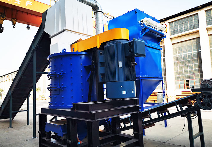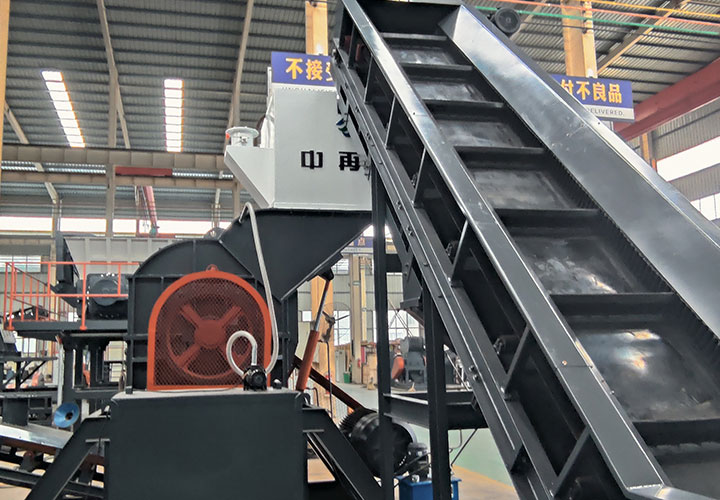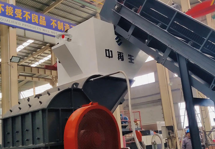 破碎線主機殼體采用特厚鋼板制造,內襯為高錳鑄鋼件,可更換;主機轉子盤安裝于水平軸上,轉子盤圓周分布有銷軸,軸向懸有錘頭;主軸用滾珠軸承支撐,循環油強制潤滑冷卻,并裝有溫度傳感器;進料口裝有液壓輥筒喂料裝置,位置一高一低,同向旋轉,能將大件松散物料壓扁,送入破碎腔內。