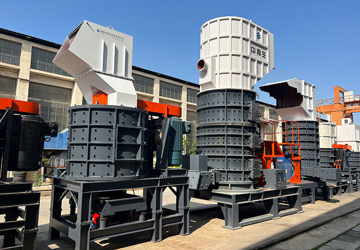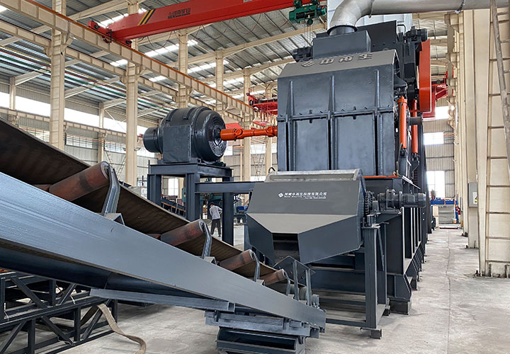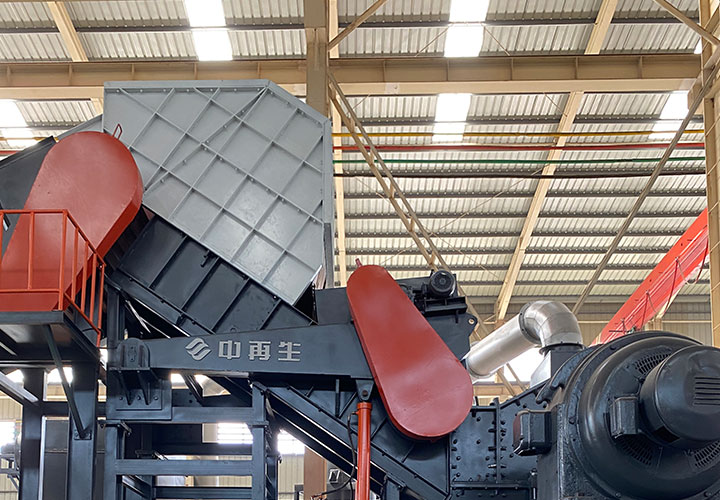 破碎線主機殼體采用特厚鋼板制造,內襯為高錳鑄鋼件,可更換;主機轉子盤安裝于水平軸上,轉子盤圓周分布有銷軸,軸向懸有錘頭;主軸用滾珠軸承支撐,循環(huán)油強制潤滑冷卻,并裝有溫度傳感器;進料口裝有液壓輥筒喂料裝置,位置一高一低,同向旋轉,能將大件松散物料壓扁,送入破碎腔內。