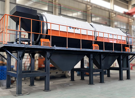 滾筒篩是分選生產線中應用非常廣泛的一種設備,它通過對顆粒粒徑大小來控制物料分選,分選精度高。滾筒篩的筒體一般分幾段,可視具體情況而定,篩孔由小到大排列,每一段上的篩孔孔徑相同,通過改變其篩子的直徑和范圍,實現物料的多級篩分作業。